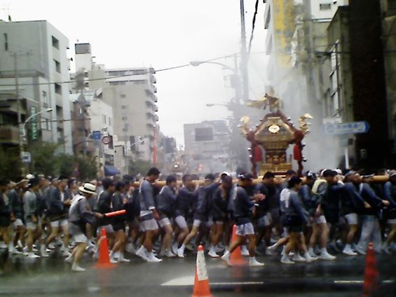門前仲町へ行くと、永代通りと清澄通りは交通規制をしていて、全面御神輿スペースとして使われていた。5時過ぎにはお祭りも終わり、けっこうな雨が降ってきた。