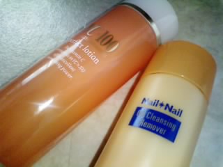 ちなみに朝の除光液事件は、このオレンジの容器の化粧水と間違えてしまいまして(左が化粧水)。両方ともこの容器のイメージ通り、柑橘系の香りがするので一瞬気がつかず、ヌリヌリしてから、なーんかオイリーと思って、「ハッ、これは除光液じゃん!」ということに気がつき、アワアワと洗面所へ。でもなんだかしっとりして、オレンジオイル入りのこの除光液は、改めてツメに優しいのかも!? と思ったりして。決してお肌には良くないだろうけどね…。