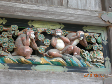 建物の欄間?に掘られているお猿さんたちは、生まれてから老いるまでストーリーとなって描かれている。“見ざる、言わざる、聞かざる”は、幼少時は余計なことには触れずスクスク育ちましょう、という話だったみたい。それにしても、この彫刻って言うんですか? すっごく写実的で見入ってしまった。